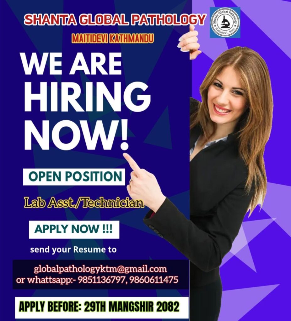 Shanta Global Pathology, a trusted diagnostic center located at Maiti Devi, Kathmandu, is inviting applications from qualified and motivated candidates for the position of Lab Assistant / Lab Technician. If you are passionate about laboratory services and looking to advance your career in a professional environment, we encourage you to apply.