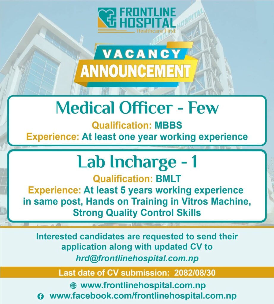 Interested and eligible candidates are requested to send their application along with an updated CV to : 📩 hrd@frontlinehospital.com.np